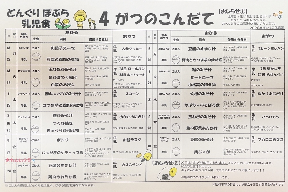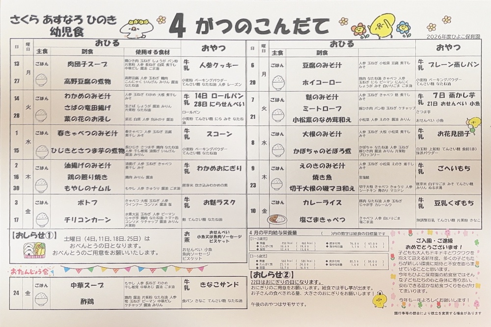 新しい環境にドキドキとワクワクでいっぱいの4月、給食室では今年も子ども達に寄り添い、安心出来る温かな給食作りを心掛けてまいります!