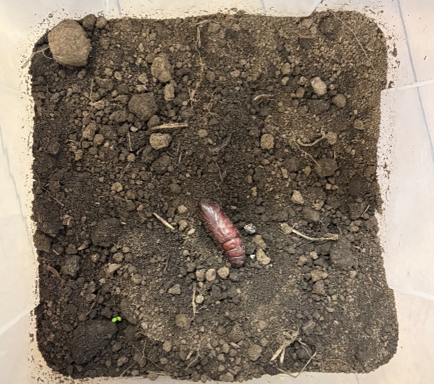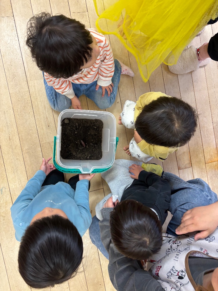 ぽぷら(2歳児)です。お散歩の途中で見つけたあおむし。葉っぱを取り換え、お水をあげ大切に育ててきました。今日見たら、さなぎに変身してるではありませんか!子どもたちが「土の中でねんねしてるんだよ」と教えてくれました。