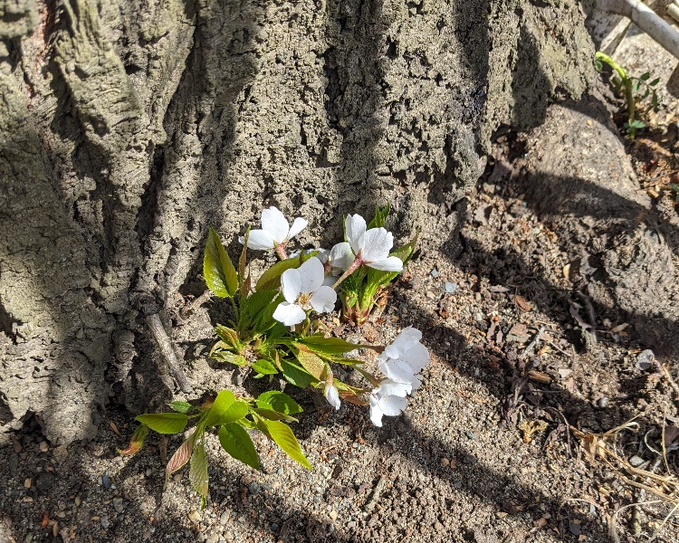 根本に咲いている「あかちゃん桜」を見つけた4歳児のお友だちが、まだつぼみの桜に向かって、頑張って咲いてねとばかりに「ガンバレ〜‼️ガンバレ〜‼️」と声をかけていました。