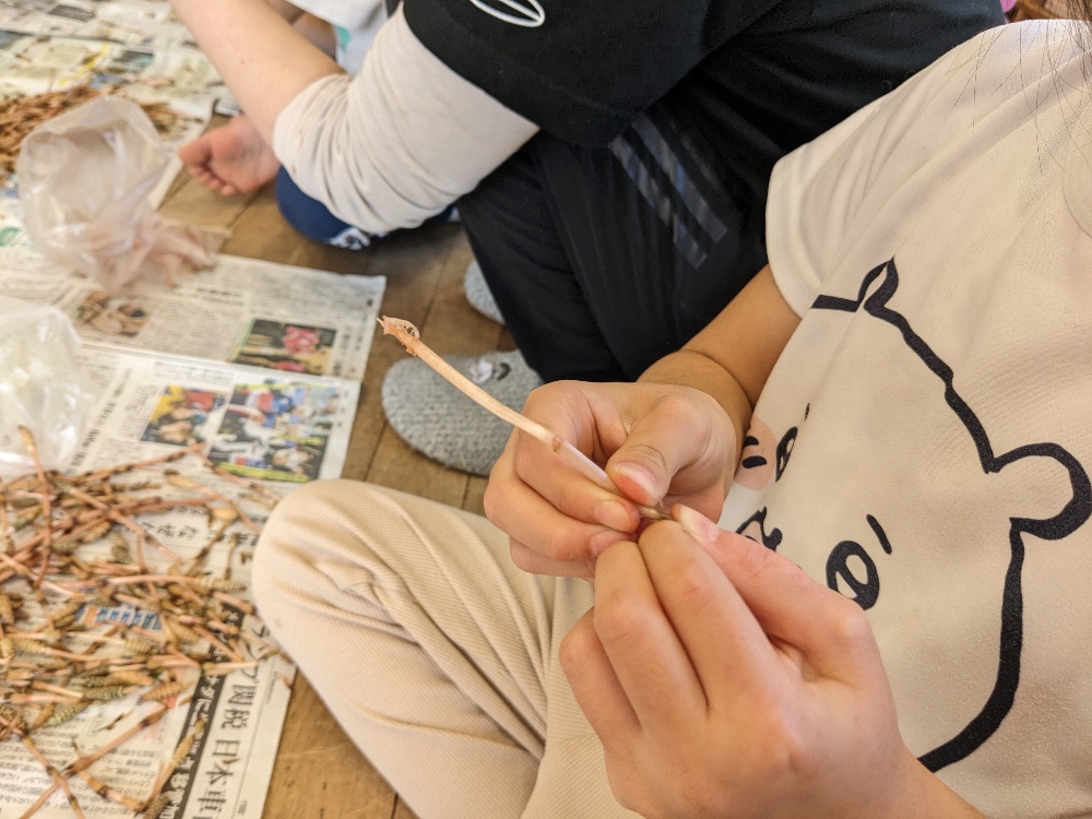 こちらは5歳児つくしを摘んできました一生懸命、はかまと頭をとっています